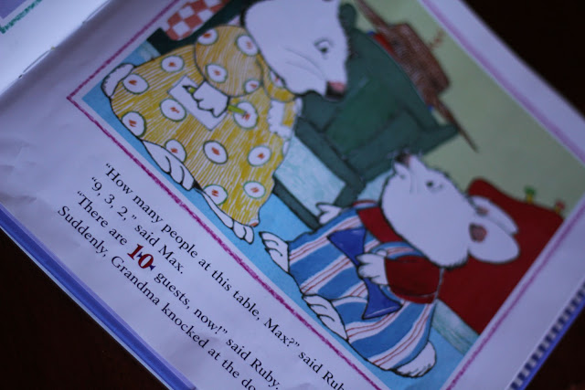 I don't remember who, but a few weeks back a friend likened you and Sam to the children's book characters Ruby and Max. Now, I've done this many times myself. That show is such a perfect example of what it is like to live with a self-assured, well-meaning, bossy big sister and quiet, sneaky, do-his-own-thing little brother. We checked a book out from the library and on one of the pages Max is counting and it goes like this: